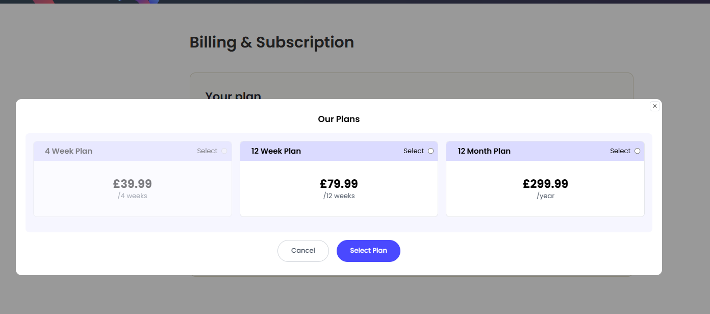 Choose from our 4 week, 12 week or annual plan, with any changes you make taking effect after your current billing period ends;