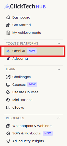 When logged into your ClickTech Hub account, access OmniAI in the Tools & Platforms section of the main menu;